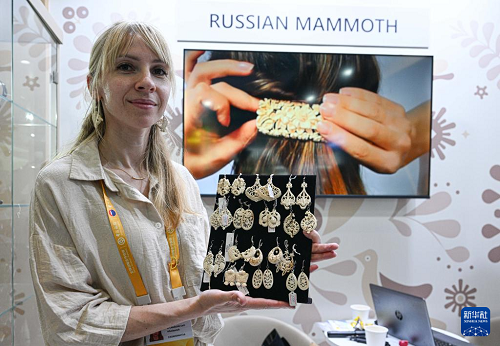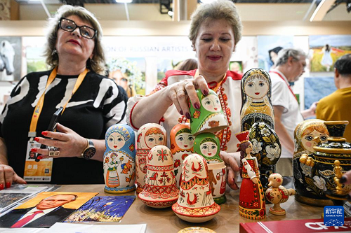4月16日,參展商在第六屆消博會(huì)現(xiàn)場(chǎng)展示俄羅斯工藝品。(新華社記者 蒲曉旭 攝)