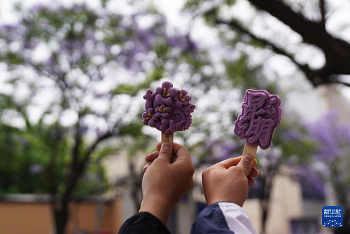 4月26日,游客在昆明市教場中路展示文創(chuàng)雪糕。(新華社發(fā) 梁志強(qiáng) 攝)