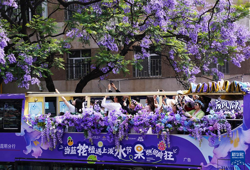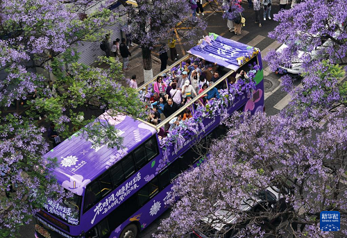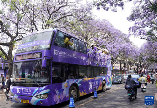 4月26日,游客乘坐藍(lán)花楹觀光巴士經(jīng)過昆明市教場中路。(新華社發(fā) 梁志強(qiáng) 攝)