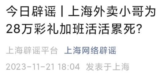 11月20日,上海網(wǎng)絡(luò)辟謠微信官方賬號(hào)發(fā)布辟謠文章。針對近日網(wǎng)傳“為掙28萬彩禮娶媳婦,上海外賣小哥活活累死”一事,經(jīng)過核查發(fā)現(xiàn),事件純屬自媒體捏造散布。