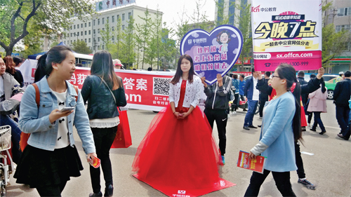 4月23日11點(diǎn)左右,記者在我市城區(qū)忻州一中校門口看到,一名身穿紅色婚紗裙的女生舉著牌子——“我媽說了,考上公務(wù)員,咱們領(lǐng)證去”。當(dāng)天是2016年山西省公務(wù)員考試筆試的日子,這是一家公考培訓(xùn)機(jī)構(gòu)在考點(diǎn)附近進(jìn)行宣傳活動,宣傳者靚麗的外表、婚紗裙的著裝和新奇的廣告語吸引了很多考生的目光,甚至一些路人也駐足觀看。不過,這種夸張的廣告詞,所謂的“考上公務(wù)員去領(lǐng)證”的想法是否正確,也應(yīng)該引起大家的反思。(許凈 攝)
