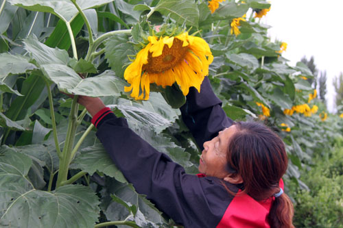 7月20日,原平市解放街農(nóng)民劉麗平正在長(zhǎng)勢(shì)喜人葵花地里打支扣進(jìn)行管理。該市積極引導(dǎo)農(nóng)民大力發(fā)展油料經(jīng)濟(jì)農(nóng)業(yè)種植,因地制宜、多措并舉,促使農(nóng)業(yè)增產(chǎn)農(nóng)民增收。(趙春曉 攝)