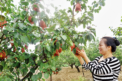 走進(jìn)梨園,記者看到,一排排梨樹枝粗葉茂,大大小小的套袋酥梨掛滿了枝頭,等待著人們的采摘?!耙郧熬褪敲考矣心敲磶卓脴?,零零散散不成氣候。現(xiàn)在形成了規(guī)?;N植,在市場上也打出了品牌。”王紅麗指了指周邊一眼看不到盡頭的梨園,介紹說這都是同村的村民種植的。為了符合人們現(xiàn)在純天然、綠色、無污染的消費(fèi)需求,所有的梨在剛成形時(shí)就被套上了袋子,不再打農(nóng)藥?!艾F(xiàn)在各家各戶都開始采摘了,再過幾天,就會(huì)有各地來的經(jīng)銷商統(tǒng)一收購?!?/p>