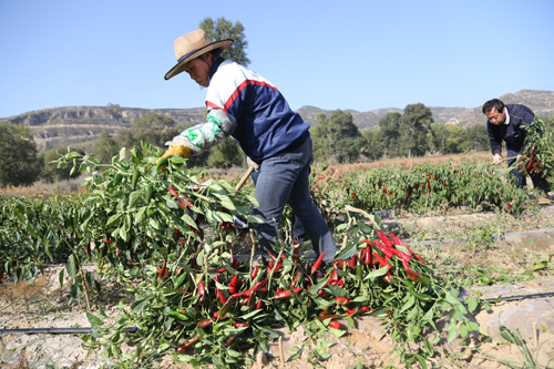 10月8日,靜樂縣永倉種植專業(yè)合作社萬畝辣椒種植示范園中10300畝辣椒喜獲豐收。近年來,該縣調整產業(yè)結構,大力發(fā)展無公害辣椒種植,引進種植新品種韓國紅辣椒。該合作社今年連片訂單栽植的10300 畝辣椒目前長勢良好,預計平均畝產6000 斤,最高可達一萬斤。今年又是一個豐產年,大伙的生活就像紅辣椒一樣過得紅紅火火。圖為合作社工人在收獲辣椒。(閆曉梅 攝)