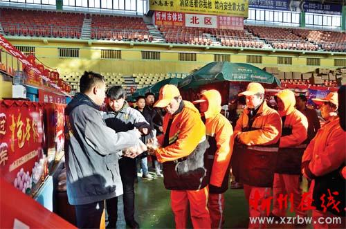 1月19日上午,山西熊奪寶網絡科技有限公司面向忻州市環(huán)衛(wèi)系統(tǒng)開展“獻愛心迎佳節(jié)”活動,來自忻州市市容環(huán)境衛(wèi)生管理處的50名環(huán)衛(wèi)工人代表,每人領到了一份新鮮雞蛋?,F場的一位工作人員告訴記者:“環(huán)衛(wèi)工人們?yōu)榱顺鞘械母蓛粽麧嵏冻隽诵燎诘暮顾?,希望這些雞蛋能為他們補補身體。除現場領取雞蛋的50名環(huán)衛(wèi)工人之外,我市另外的1000多名環(huán)衛(wèi)工人也將陸續(xù)領到愛心雞蛋?!鳖I到雞蛋的環(huán)衛(wèi)工李大姐高興地說:“今年過年雞蛋也不用買了,實在是太好了!”(王菲 郭劍鳴 攝)
