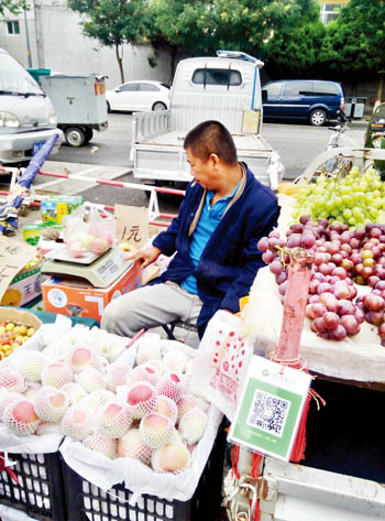 7月30日,位于和平街市中級(jí)人民法院旁的便民市場(chǎng)上,一位水果商販正在出售水果。三輪車上掛著微信支付二維碼,告訴顧客可以用手機(jī)掃一掃買水果。小販說(shuō):“現(xiàn)在用手機(jī)支付的人越來(lái)越多,特別是年輕人。手機(jī)支付,不用找零,不怕假幣,‘掃一掃’,就是好!”