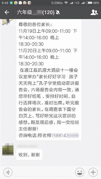 記者聯(lián)系上負責講座咨詢的程老師,他表示,此次活動并沒有和通江縣教育科技體育局聯(lián)系,在和通江縣實驗小學對接時,確實講過要向?qū)W校捐贈孔子文化教室,但目前還未定。在酒店舉行講座的事情沒有向通江縣實驗小學提過。他們在學校門口組織志愿者發(fā)調(diào)查表,在通江的其他學校門口也發(fā)了調(diào)查表。對于老師在群里向家長發(fā)講座信息,程老師表示是個人行為,義務(wù)幫忙。程認為,講座不收錢就是公益講座,推銷產(chǎn)品家長購買是家長的自愿行為。