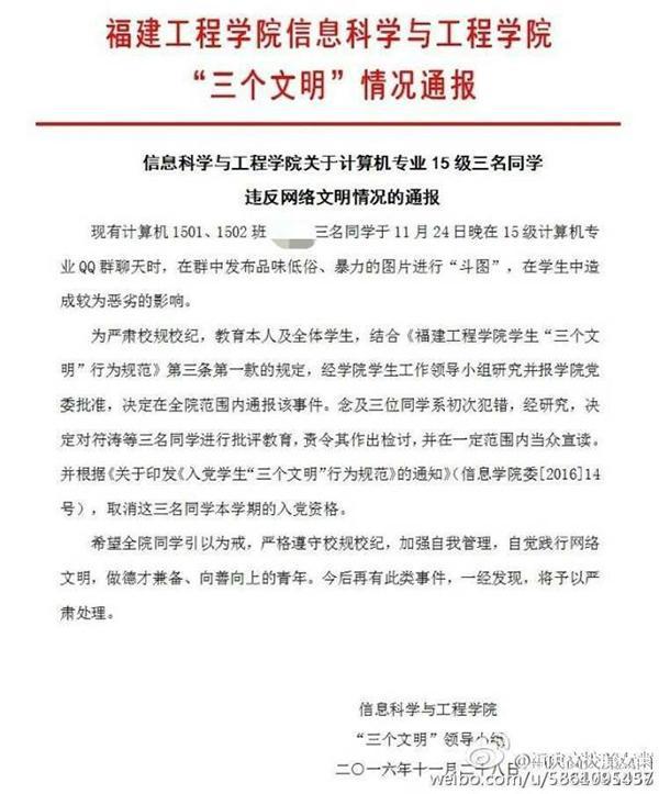 11月29日,微博號“福州大學(xué)城新鮮事”發(fā)布《厲害了工院!學(xué)生“斗圖”被通報批評》一文,并貼出《信息科學(xué)與工程學(xué)院關(guān)于計算機專業(yè)15級三名同學(xué)違反網(wǎng)絡(luò)文明情況的通報》(以下簡稱《通報》),引起網(wǎng)友熱議,有人稱“學(xué)校小題大做”。