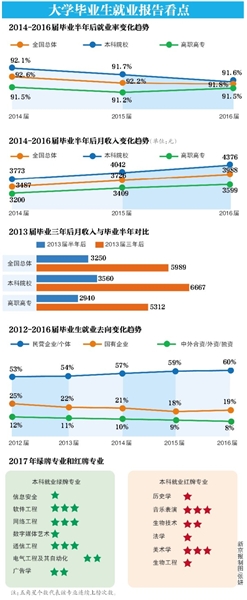 報告調(diào)查分析顯示,2016屆本科畢業(yè)生半年后月收入達到4367元,比2015屆增長334元。從各專業(yè)就業(yè)率、收入和就業(yè)滿意度等方面數(shù)據(jù)分析,信息安全、軟件工程等專業(yè)因就業(yè)率高、薪資好被列為“綠牌專業(yè)”;歷史學(xué)、美術(shù)學(xué)等專業(yè)被列為“紅牌專業(yè)”。