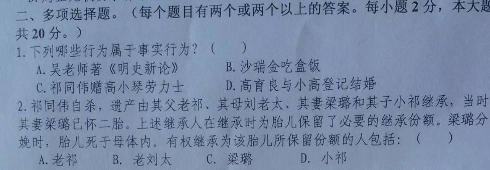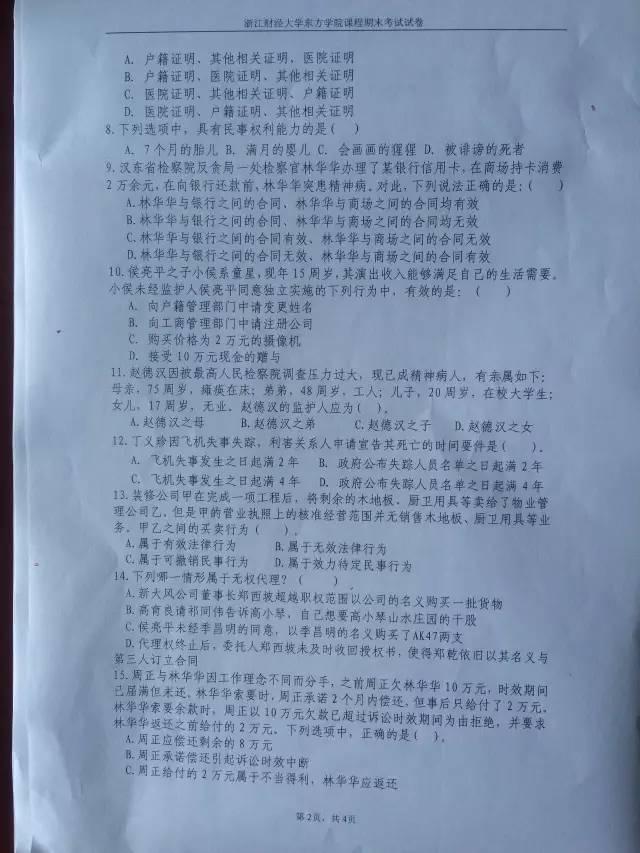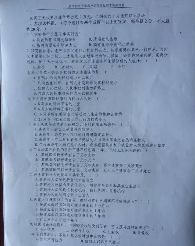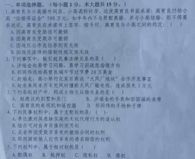 今年最火的電視劇,非《人民的名義》莫屬。 由于這部劇體現(xiàn)了“反腐”這一重大社會主題,有人專門將《人民的名義》設計成了一套高考模擬題,比如這道: 《人民的名義》一經(jīng)播出,便收獲觀眾熱情的點贊。它反映著當前中國反腐敗斗爭的實踐,回應著反腐敗的民心所愿。反對腐敗、建設廉潔政府,必須“把權力關進制度的籠子里”。下列做法中,直接體現(xiàn)這一要求的是( ) ①國務院取消下放618項行政審批事項 ②某省民政廳開展“廉政親情寄語”活動 ③某市發(fā)展與改革委員會推行“開放式?jīng)Q策” ④某全國人大代表提出“規(guī)范網(wǎng)絡反腐”議案 A.①③ B.①④ C.②③ D.②④ 追劇的童鞋們,是不是頓時感覺整部劇是滿滿的政治考點?雖然高考已經(jīng)過去,但是期末考還在路上,萬一考到了呢? 昨天,浙江財經(jīng)大學東方學院法學專業(yè)的學生就碰上了“萬一”——《民法總論》的期末考試試卷,竟通篇引用《人民的名義》?。?!