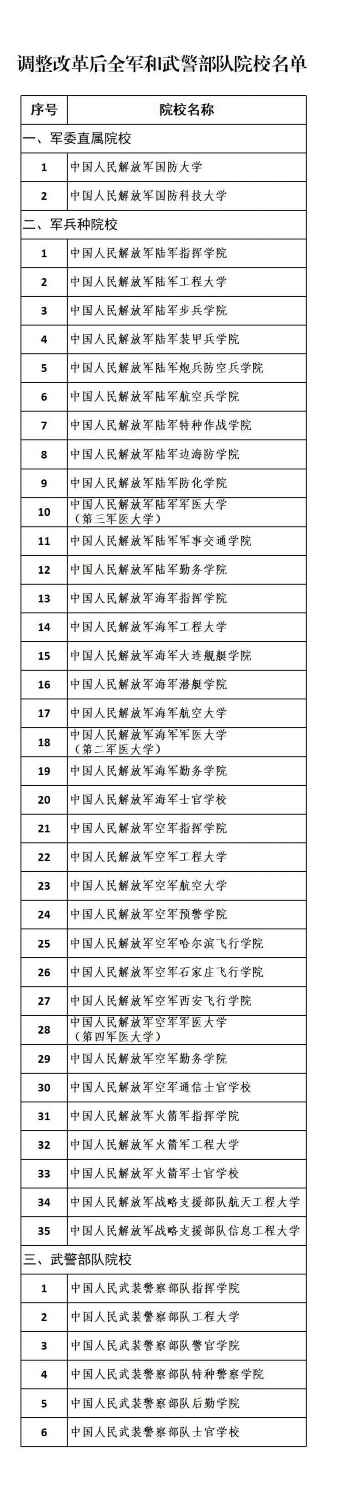 記者:這個(gè)月迎來(lái)高考季,“軍隊(duì)院校在全國(guó)各省市招生計(jì)劃”披露了部分軍隊(duì)院校的名稱(chēng)。能否介紹改革后軍隊(duì)院校的總數(shù)和名稱(chēng)?