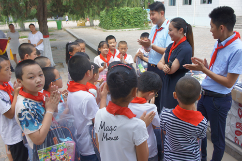 活動現(xiàn)場,公司職工在董事長張紫涵的帶領(lǐng)下同孩子們一起升國旗,進(jìn)行學(xué)習(xí)用品的捐贈,并勉勵他們好好學(xué)習(xí),天天向上。為表示感謝,孩子們把紅領(lǐng)巾親自給叔叔阿姨們系上,學(xué)校校長張喜年也把一面“愛心捐助,善行義舉”的錦旗送到董事長張紫涵的手中。(李濤 攝)