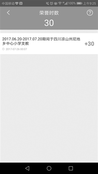 “你下載‘志愿匯’APP,第二天直接登錄無(wú)需注冊(cè),登錄名是身份證號(hào)碼,密碼為后八位?!卑凑仗崾荆浾咪浫肓讼嚓P(guān)信息,選擇了30個(gè)小時(shí)的志愿時(shí)長(zhǎng)。第二天,打開“志愿匯”后,上面果然顯示了30個(gè)小時(shí)的志愿時(shí)長(zhǎng),還有詳細(xì)的志愿地點(diǎn)、時(shí)間,和記者填寫的信息一致。