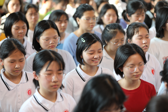 6月28日,湖南永州道縣第一中學(xué)學(xué)生在緊張準備高考的同時,參加心理講座,開展快樂減壓活動。視覺中國供圖