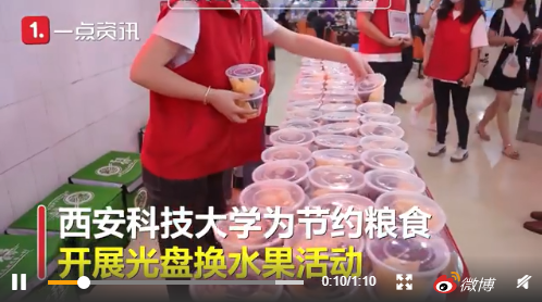 西安科技大學(xué)為節(jié)約糧食開展了光盤換水果的活動,學(xué)生們只要把飯菜吃完清盤,就可以換到一份飯后果盤和代金券。校方介紹,他們每餐準(zhǔn)備了500份水果,該活動推出之后,收餐量減少了40%到50%。