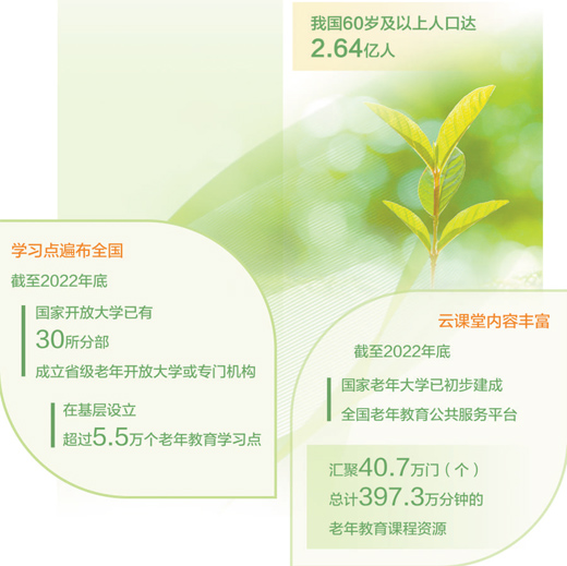 國家老年大學開展線上線下相結合的教學活動,學員們既可以在線下老年教育學習點學習,也可以在線學習各種課程。國家開放大學黨委副書記劉臣介紹,截至2022年底,國家開放大學已有30所分部成立省級老年開放大學或專門機構,在基層設立超過5.5萬個老年教育學習點,為搭建國家老年大學辦學服務網絡提供了堅實支撐。