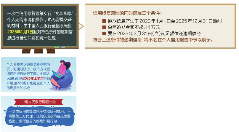 在進行必要的技術(shù)準(zhǔn)備后,中國人民銀行于22日明確發(fā)布一次性信用修復(fù)政策有關(guān)安排。自2026年1月1日起征信中心將根據(jù)不同還款情形完成自動調(diào)整,相關(guān)逾期記錄不再在個人信用報告中展示。