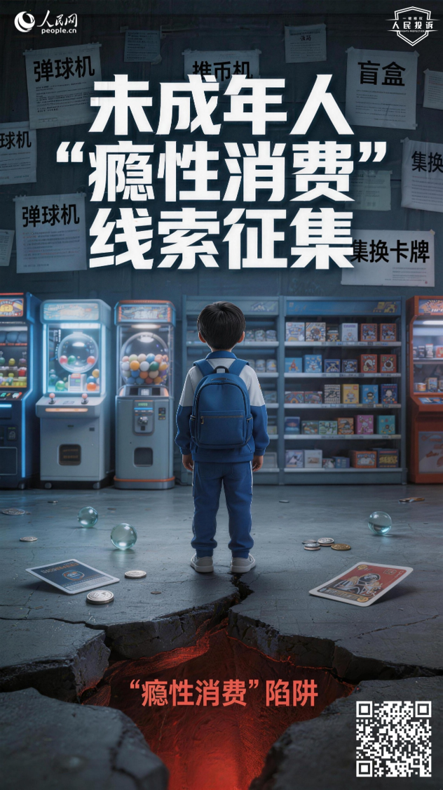 從彈珠機、推幣機到集換卡牌、盲盒扭蛋,一些線下消費場所正利用“隨機獎勵”“差一點就中”等心理機制,讓孩子反復投入、難以自拔,卻無年齡限制或防沉迷提示。孩子的成長不該被“癮性陷阱”裹挾,未成年人的合法權益更應得到堅實守護。即日起,人民網“人民投訴”平臺征集未成年人“癮性消費”線索。如果您遇到以下情況,請告訴我們: