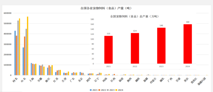 中國飼料工業(yè)協(xié)會數(shù)據(jù)顯示,2024年全國寵物飼料(主糧)產(chǎn)量達(dá)160萬噸,比五年前增長66.7%,連續(xù)多年保持兩位數(shù)增長。2025年前7個月,產(chǎn)量達(dá)100.6萬噸,同比增長14.5%。