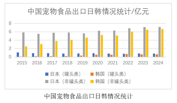 王金全分析認(rèn)為,日韓是我國寵物食品重要出口地,2022年占出口總額12%,中國品牌憑性價(jià)比與差異化切入日本市場,2024年對韓非罐裝類出口額較2015年翻倍。