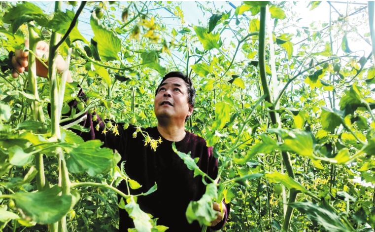 武文光察看圣女果長(zhǎng)勢(shì)。本報(bào)記者 劉 捷攝