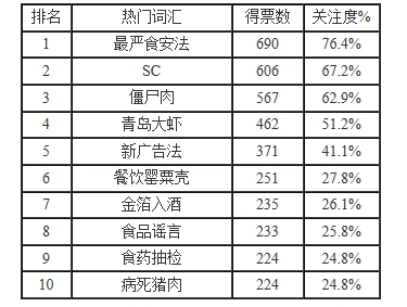 據(jù)悉,本次活動首先由食品伙伴網(wǎng)的“食品論壇”板塊網(wǎng)友針對2015年的熱門事件概括成一個關(guān)鍵詞,之后經(jīng)過整理篩選出20個候選詞匯,并于2016年1月21日-2月17日在食品論壇投票。期間共有 902位經(jīng)過審核認證的注冊網(wǎng)友參與投票,最終選出十大熱門詞匯。