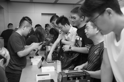 iPhone7開賣后受追捧,圖為開賣首日華貿(mào)蘋果店現(xiàn)場。京華時(shí)報(bào)記者陶冉攝