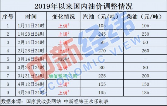 據(jù)中新經(jīng)緯客戶端統(tǒng)計(jì),2019年以來(lái),按照“十個(gè)工作日”一調(diào)整原則,國(guó)內(nèi)成品油已調(diào)整8次。加上3月31日24時(shí)因增值稅率下調(diào),國(guó)內(nèi)成品油價(jià)格調(diào)整呈現(xiàn)“七漲一跌一擱淺”格局。具體來(lái)看,汽油累計(jì)上漲875元/噸;柴油累計(jì)上漲860元/噸。