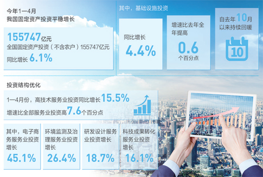 打開(kāi)今年頭4個(gè)月的投資“成績(jī)單”,延續(xù)了增長(zhǎng)平穩(wěn)的態(tài)勢(shì)。今年前4月,全國(guó)固定資產(chǎn)投資同比增長(zhǎng)6.1%,增速比去年全年加快0.2個(gè)百分點(diǎn)。