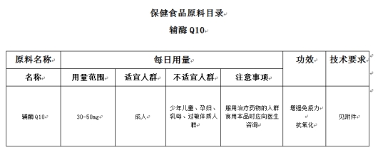 《通知》指出,含輔酶Q10的產(chǎn)品,其輔酶Q10的每日推薦食用量不得超過50mg。我國已批準(zhǔn)的輔酶Q10保健食品(增強(qiáng)免疫力、抗氧化保健功能)每日用量范圍是10-50mg。關(guān)于公開征求輔酶Q10等5種保健食品原料目錄意見的公告》明確,輔酶Q10用量范圍為每日30-50mg。