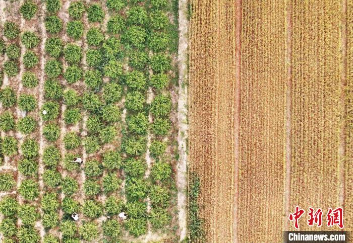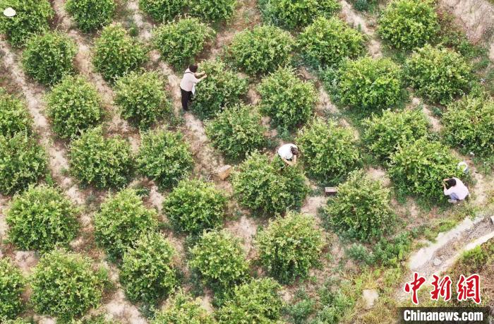山西省運(yùn)城市新絳縣澤掌鎮(zhèn)喬溝頭村,幾名花農(nóng)在田間采摘金銀花。(無(wú)人機(jī)照片)高新生 攝