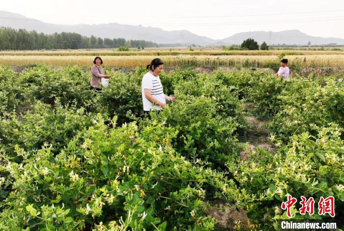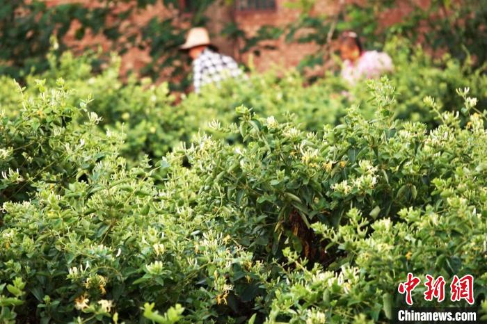 山西省運(yùn)城市新絳縣澤掌鎮(zhèn)喬溝頭村,花農(nóng)采摘喜獲豐收的金銀花。高新生 攝