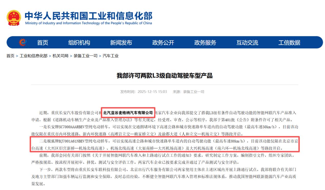 12月15日,北汽集團(tuán)旗下極狐阿爾法S(L3版)正式獲批工業(yè)和信息化部自動(dòng)駕駛車型產(chǎn)品準(zhǔn)入許可,即將在北京市限定區(qū)域內(nèi)開展L3級有條件自動(dòng)駕駛上路通行試點(diǎn)。這標(biāo)志著我國自動(dòng)駕駛技術(shù)發(fā)展逐步走向量產(chǎn)應(yīng)用階段,也是北汽集團(tuán)在自動(dòng)駕駛領(lǐng)域從技術(shù)驗(yàn)證階段邁向量產(chǎn)應(yīng)用階段的重要里程碑。