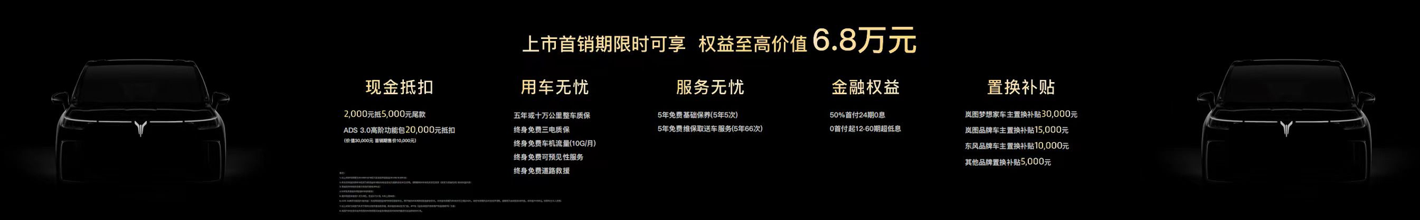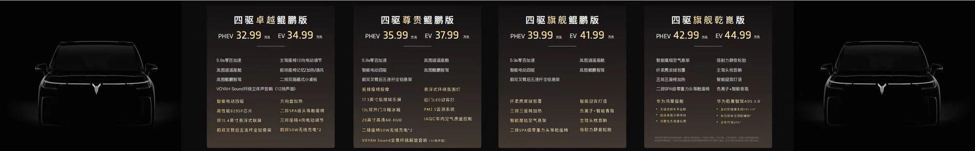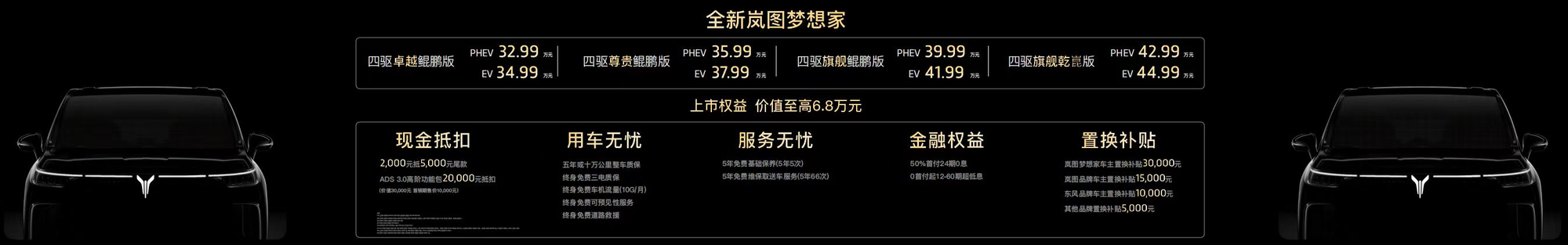 央廣網(wǎng)北京9月20日消息(記者 姜鵬)9月19日,以“感恩相伴 夢(mèng)想同行”為主題的東風(fēng)汽車感恩6000萬(wàn)用戶相伴暨全新嵐圖夢(mèng)想家上市發(fā)布會(huì)于武漢成功舉辦,全新嵐圖夢(mèng)想家正式上市并公布價(jià)格,其中,全新嵐圖夢(mèng)想家四驅(qū)卓越鯤鵬版PHEV 32.99萬(wàn)元、EV 34.99萬(wàn)元;全新嵐圖夢(mèng)想家四驅(qū)尊貴鯤鵬版PHEV 35.99萬(wàn)元、EV 37.99萬(wàn)元;全新嵐圖夢(mèng)想家四驅(qū)旗艦鯤鵬版PHEV 39.99萬(wàn)元、EV 41.99萬(wàn)元;全新嵐圖夢(mèng)想家四驅(qū)旗艦乾崑版PHEV 42.99萬(wàn)元、EV 44.99萬(wàn)元。同時(shí),截至10月10日,嵐圖還為用戶提供至高6.8萬(wàn)元的首銷期專享權(quán)益,包含2千元抵5千元現(xiàn)金抵扣,原價(jià)3萬(wàn)首銷期僅需1萬(wàn)元的ADS3.0高階智駕包;此外還有用車無(wú)憂、服務(wù)無(wú)憂、0息金融等權(quán)益;針對(duì)換購(gòu)的用戶還有至高3萬(wàn)元的置換補(bǔ)貼。