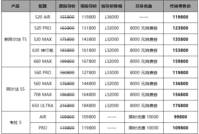 即日起,極狐對新阿爾法T5和阿爾法S5官方指導價進行下調,官方降價32000元,還可另享8000元消費券,如此一來,5系“雙子星”終端零售價最低僅需11.98萬元;考拉S限時優(yōu)惠增至10000元,終端零售價直接下探到了9.98萬元起。