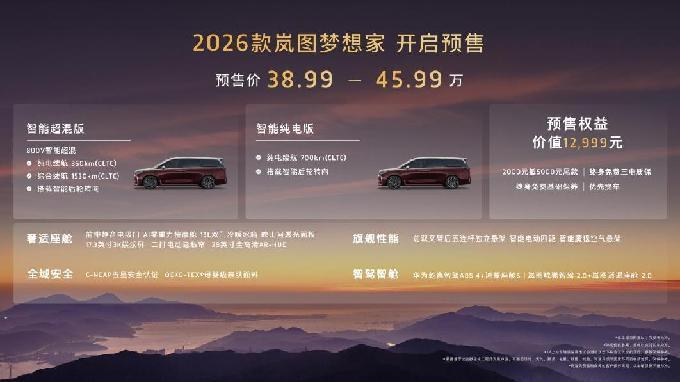8月29日,第二十八屆成都國際汽車展覽會盛大開幕。全面煥新升級的“新時代旗艦MPV”2026款嵐圖夢想家預(yù)售亮相。本次新車共推出智能超混版和智能純電版兩個動力版本,預(yù)售價為38.99萬-45.99萬,同步推出了價值超萬元的多項重磅權(quán)益,包括2000元抵5000元尾款的膨脹金,終身免費三電質(zhì)保、終身免費基礎(chǔ)保養(yǎng)和優(yōu)先交付提車。9月1日起,2026款嵐圖夢想家展車、試駕車將陸續(xù)到店,消費者可以進店親自體驗新車的獨特魅力。