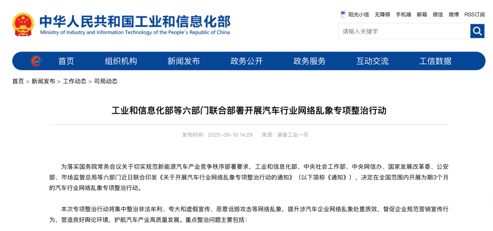 央廣網(wǎng)北京9月10日消息(記者董楠)9月10日,工業(yè)和信息化部(以下簡稱“工信部”)、中央社會工作部、中央網(wǎng)信辦、國家發(fā)展改革委、公安部、市場監(jiān)管總局等六部門聯(lián)合印發(fā)《關(guān)于開展汽車行業(yè)網(wǎng)絡(luò)亂象專項整治行動的通知》,決定在全國范圍內(nèi)開展為期3個月的汽車行業(yè)網(wǎng)絡(luò)亂象專項整治行動。 本次專項整治行動將集中整治非法牟利、夸大和虛假宣傳、惡意詆毀攻擊等網(wǎng)絡(luò)亂象,提升涉汽車企業(yè)網(wǎng)絡(luò)亂象處置質(zhì)效,督促企業(yè)規(guī)范營銷宣傳行為,營造良好輿論環(huán)境,護(hù)航汽車產(chǎn)業(yè)高質(zhì)量發(fā)展。