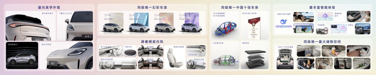 步入“舒嶼座艙”,細節(jié)皆巧思。繽果S以“靜奢棲居美學”為靈感,通過環(huán)抱式布局、貫穿式內嵌風幕與柔感貝殼座椅等設計,營造出沉浸式的舒適氛圍。搭配同級唯一的6揚聲器系統(tǒng)與阿嘉米斯專業(yè)聲場調校,進一步提升了座艙的靜謐質感與聽覺享受。12.8英寸高清大屏內置“1+N”靈語AI中樞大模型,深度融合DeepSeek大模型,以更全面的壁紙玩法、八大區(qū)域的方言溝通、更多的智能場景應用,為用戶帶來真正“更懂你的”智能座艙體驗。