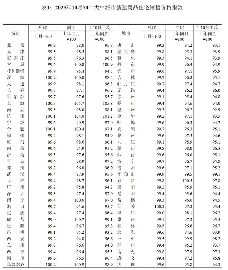 據(jù)國家統(tǒng)計局數(shù)據(jù),10月份,一線城市新建商品住宅銷售價格環(huán)比下降0.3%,降幅與上月相同。其中,上海上漲0.3%,北京、廣州和深圳分別下降0.1%、0.8%和0.7%。二線城市新建商品住宅銷售價格環(huán)比下降0.4%,降幅與上月相同。三線城市新建商品住宅銷售價格環(huán)比下降0.5%,降幅擴大0.1個百分點。