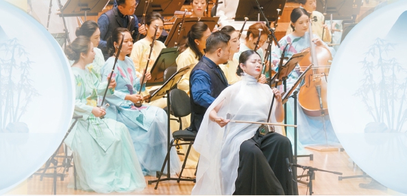 演出由知名華人指揮家湯沐海執(zhí)棒,來自上海民族樂團(tuán)的70余位演奏家一同奏響華章?!昂I仙駱贰狈忠魳窌婧蜕虾R魳窂d駐場版,前者偏向西方當(dāng)代交響音樂會的制式,后者則融入多媒體光影,更傾向于沉浸式音樂現(xiàn)場。因而,曲目會根據(jù)現(xiàn)場環(huán)境和觀眾特征做適當(dāng)調(diào)整。國外演出時,會增加二胡與樂隊合奏的《臥虎藏龍》(見上圖)——這是東西方觀眾都熟悉,甚至?xí)谘矍案‖F(xiàn)出竹林搖曳畫面的曲目。音樂會版在編曲上的處理會在尾聲處以漸強手法處理中西樂器的合奏共鳴,把情感推向高潮。琵琶、京胡與樂隊合奏的《楚漢》中,俞冰的琵琶獨奏氣勢不凡,凸顯出西楚霸王的威武。嗩吶與樂隊合奏《鳳舞》時,胡晨韻不僅能吹出一個超乎常人想象的長音,還能與笛子手等一起營造一群鳥兒的生動“對話”,時而平和時而激動,惹得觀眾忍俊不禁。而改編自膾炙人口的《野蜂飛舞》的民樂重奏《蜂飛》則賦予俄羅斯作曲家里姆斯基-科薩科夫的經(jīng)典名曲“中華風(fēng)韻”——眼見著民族樂器在王音睿、趙臻、丁龍等掌控的打擊樂、笙和二胡的樂音中展現(xiàn)出妙趣橫生的“畫面”。而開場,金鍇與趙韻夢領(lǐng)銜的竹笛與樂隊合奏《湖光》則凸顯出江南文化的音樂聲色。