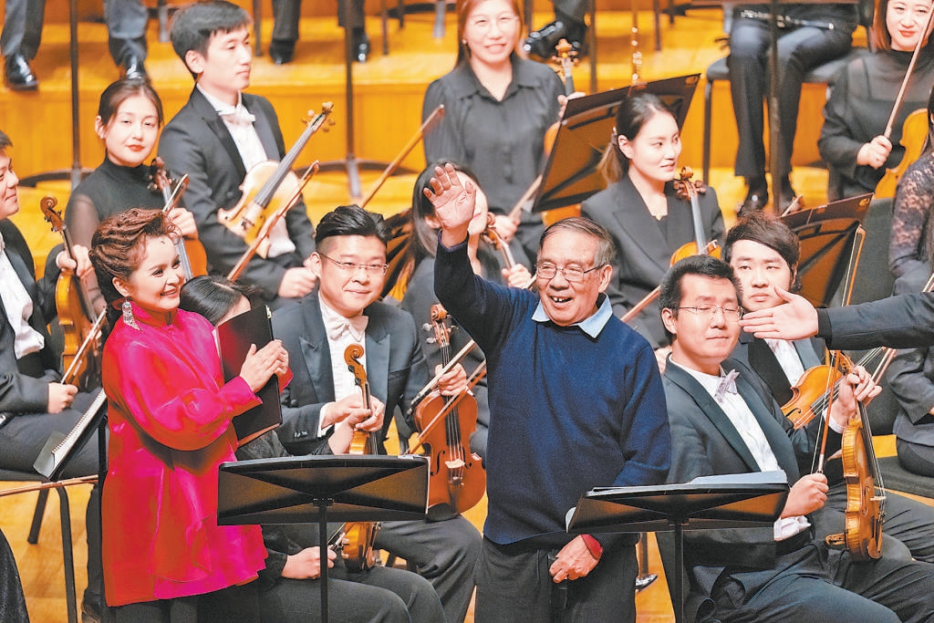 吳碧霞、黃訓(xùn)國的演唱同樣精彩,特別是在《小河淌水》《看秧歌》等選段中,吳碧霞的美妙高音與混聲合唱的互動鮮明流暢,總博得熱烈喝彩。最后一曲《孳孳》唱響,余韻中,鮑元愷登臺向觀眾致意,筆耕不輟、用幾十載時光豐盈“炎黃風情”的作曲家,收獲全場經(jīng)久不息的掌聲。