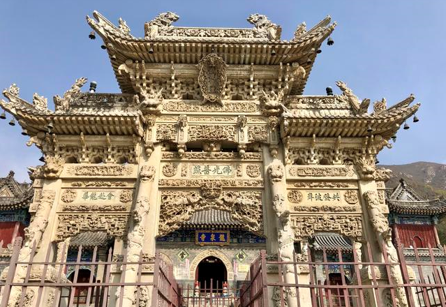 龍泉寺到了中院,它也可分為三層,即:門殿、宗堂殿、祖師堂。最后一座小院中間,屹立著藏式漢白玉石塔一座。這是南山寺第一代住持普濟和尚的墓塔。然后在龍泉寺北約五百米處,有一座令公塔,墓葬的是楊家將中的楊業(yè)。更值得一提的是,龍泉寺山門前是一片石砌、石雕的藝術世界。那里漢白玉石牌樓和青磚照壁,其工藝之精湛令人嘆為觀止,堪稱近代石雕藝術中的珍品。