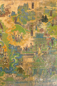 但巖山寺金代壁畫有確切年代,是御前承應畫匠王逵用10年時間才完成這一煌煌巨制。800多年前,王逵面對四壁,決然舍棄慣常的連環(huán)畫形式,大膽獨創(chuàng),采用滿幅構圖形式,以一組繁雜的宮廷建筑為中心,配以各種故事情節(jié)畫面,然后用山水、樹石、云嵐連結,細部真實,透視準確,遠看儼然一幅氣勢磅礴的大型山水畫,近瞧卻又章回分明。壁畫上就有多處使用瀝粉堆金裝飾,顯現(xiàn)金碧輝煌、富麗非凡的效果。這樣大面積的工筆重彩畫,一絲不茍,找不到起稿與粉本痕跡,而且線條變化多樣,無一廢筆,令人驚嘆。