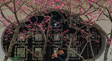 近日,上海青浦區(qū)曲水園內,紅梅、白梅、蠟梅競相綻放,吸引眾多市民前來賞花。王初攝(人民圖片網)