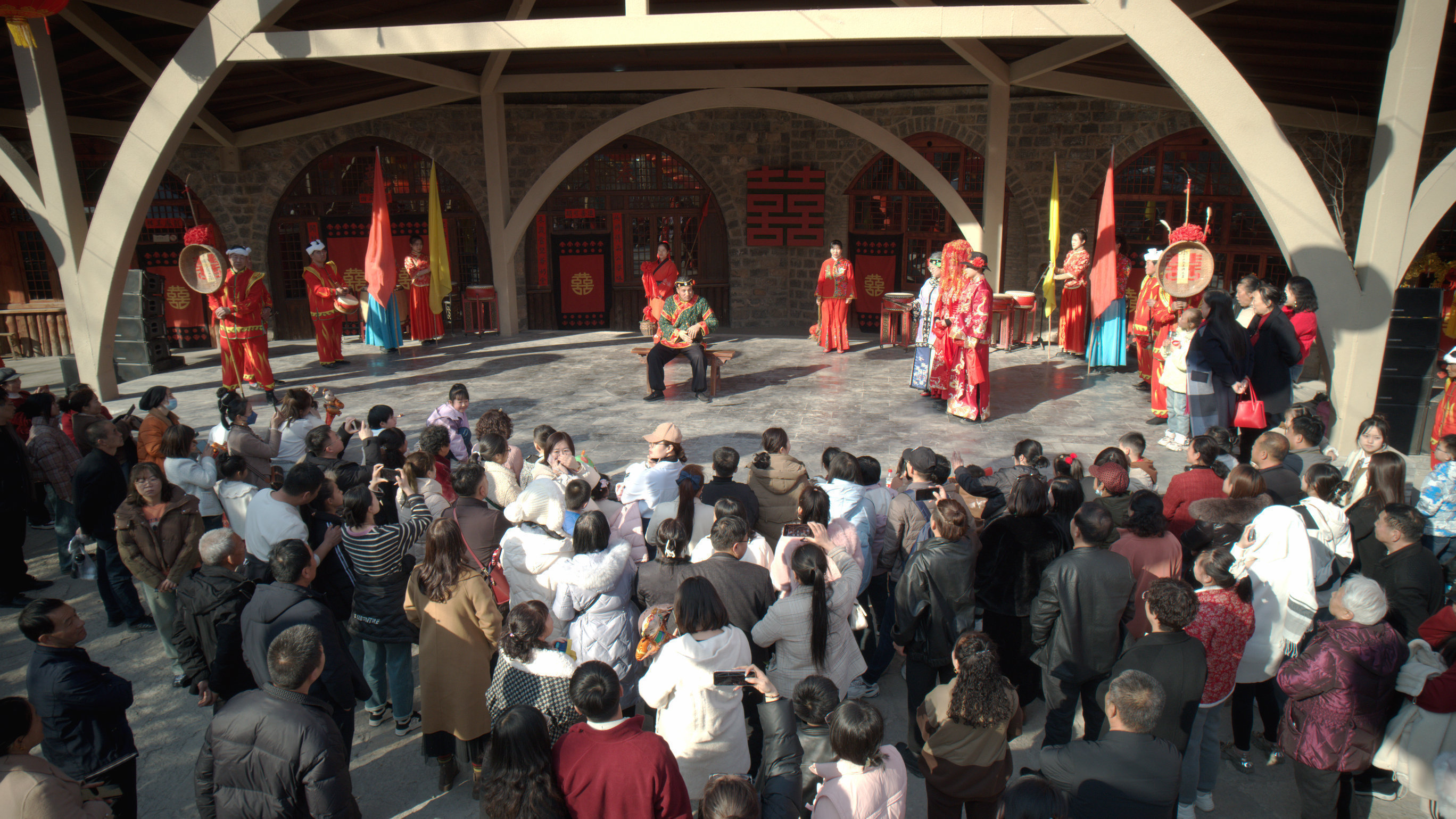 紅火的燈籠、喜慶的中國節(jié)、鮮艷的“樹掛”扮靚了塔爾坡古村,年味濃濃,喜氣洋洋。喜慶嗩吶,大紅花轎,在“婚俗院”可近距離感受傳統(tǒng)婚俗文化?!靶吕伞薄靶履铩睋Q碗吃面、“婆婆”抱鹽罐等婚俗情景表演,讓人忍俊不禁、歡笑不斷?!耙谤o子喳,喳梅花,梅花坡哩人蒞啦……”本土歌手原汁原味的鄉(xiāng)寧民歌,博得陣陣掌聲和喝彩。