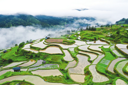 圖為5月19日拍攝的貴州省黎平縣尚重鎮(zhèn)洋洞村梯田(無人機(jī)照片)。小滿節(jié)氣前,貴州省黔東南苗族侗族自治州黎平縣尚重鎮(zhèn)洋洞村周圍的梯田蓄水豐盈,一場(chǎng)新雨過后,云霧繚繞,如詩如畫。