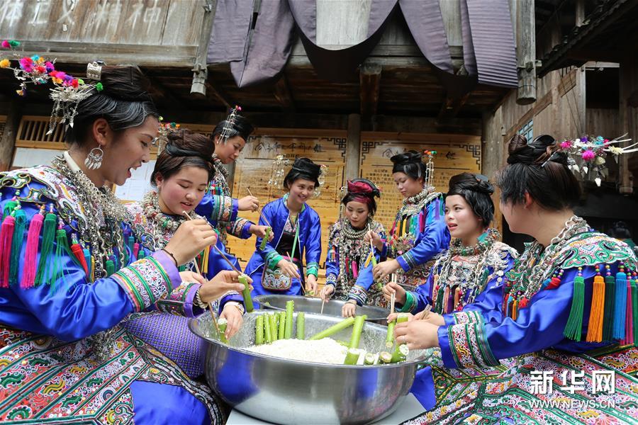 5月3日,貴州省首批魅力侗寨——榕江縣烏公侗寨歡度傳統(tǒng)的竹米節(jié),重溫侗民遠(yuǎn)古農(nóng)耕風(fēng)情。竹米節(jié)也叫吃竹筍飯,在每年谷雨至立夏期間竹筍生長的時(shí)候,侗族群眾采摘斑竹筍,把糯米灌進(jìn)筍筒煮熟食用。這樣既能保持米飯的原味,又有竹筍的清香,并且還方便攜帶至坡上田間地頭食用。久而久之,侗族人每到春夏之交的農(nóng)耕時(shí)節(jié)都會過竹米節(jié),殺豬宰羊祭祀侗族祖先,唱歌跳舞祈求五谷豐登。新華社發(fā)(楊成利 攝)