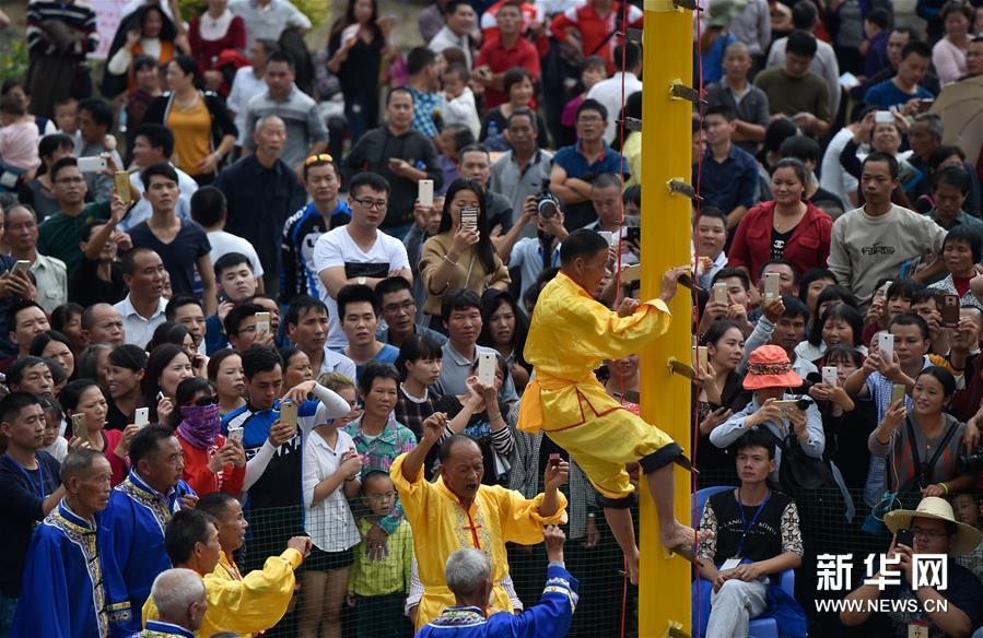 農(nóng)歷十月十五前后,福建西部武平縣各山村陸續(xù)進(jìn)入農(nóng)閑時(shí)節(jié)。按照當(dāng)?shù)仫L(fēng)俗,不同村子各自擇日舉辦民間活動(dòng),其中較有代表性的就是“上刀山”絕技。“上刀山”絕技在閩西山村流傳已有數(shù)百年歷史,表演者需光腳順著磨得鋒利閃亮的36把鋼刀,攀登至8米高的杉木柱子頂部,接受長者祝福,祈求風(fēng)調(diào)雨順、五谷豐登。新華社記者 宋為偉 攝