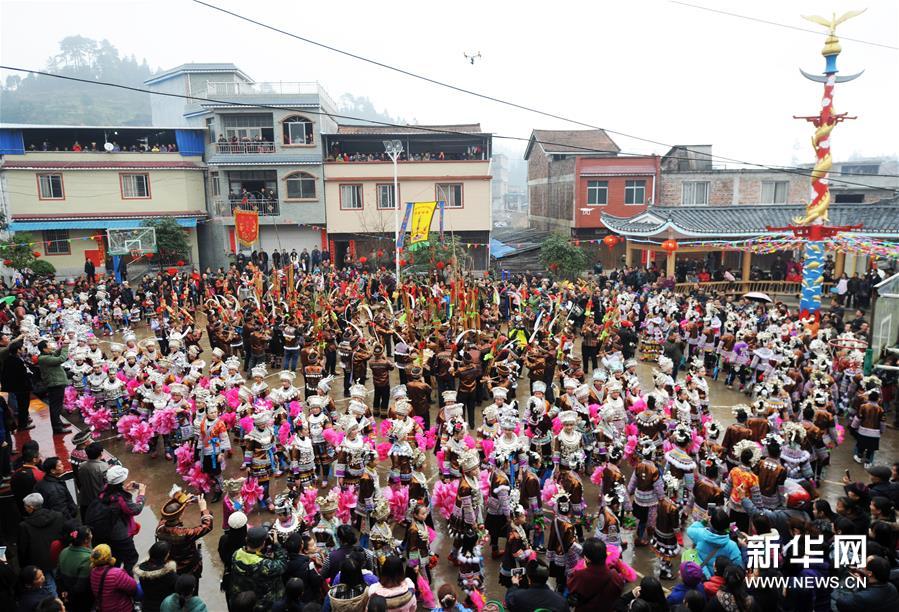 2月7日,廣西融水苗族自治縣安太鄉(xiāng)苗族群眾開展傳統(tǒng)的“打同年”民俗活動(dòng)。當(dāng)?shù)財(cái)?shù)百名苗族同胞與游客們歡聚一堂,一起開展對(duì)歌、蘆笙踩堂、文藝晚會(huì)等活動(dòng),歡慶新春佳節(jié)。 “打同年”是融水苗族村寨的一種民俗,即友好村寨之間的拜年聯(lián)歡活動(dòng)。新華社記者 李斌 攝