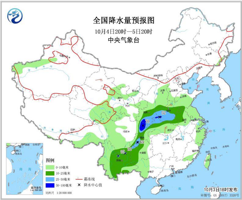 10月4日20時(shí)至5日20時(shí),西北地區(qū)東南部、黃淮西部、江淮西北部、江漢北部、西南地區(qū)東部和南部等地的部分地區(qū)有中到大雨,陜西南部、河南西部、四川盆地東北部等地局地有暴雨(50~70毫米)。遼寧中部、甘肅河西、河南北部、湖北中部等地的部分地區(qū)有5~6級(jí)風(fēng)(見(jiàn)圖4)。